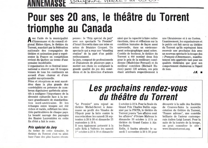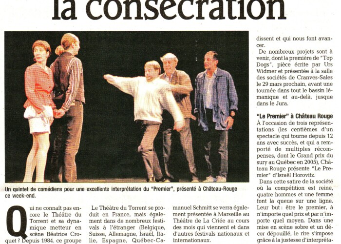 De 1996 à 2009, le Théâtre du Torrent a tourné « Le Premier » avec succès.