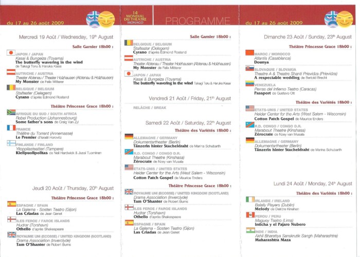 Le Théâtre du Torrent a eu l’honneur d’y représenter la France parmi 27 pays venus de tous les continents. Tous les spectacles sélectionnés pour participer à cette prestigieuse manifestation qui a lieu tous les quatre ans, étaient donnés dans leur langue d’origine.